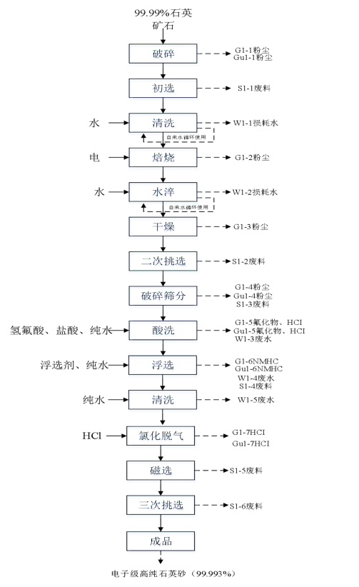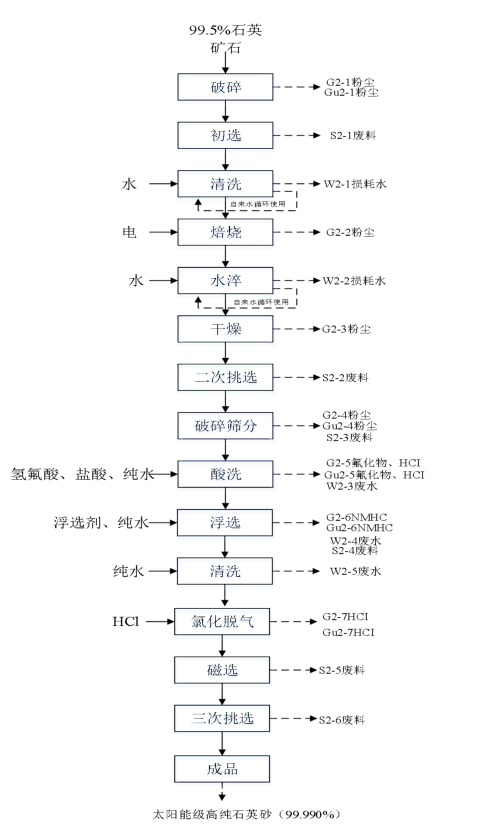 项目总投?0000万元,新?条生产线,包括送料机、破碎机、除尘设备、煅烧炉、反应釜、多级浮选机、烘干机、磁选机、振动筛等设备,采用石英矿石—破碎—初选—清洗—焙烧—水淬—干燥—二次挑选—破碎筛分—酸洗—浮选—清洗—氯化脱气—磁选—三次挑选—成品等工艺流程,形成年?0000吨高纯石英砂的生产能力,其中电子级高纯石英砂4000?年,太阳能级高纯石英?000?年、/p>