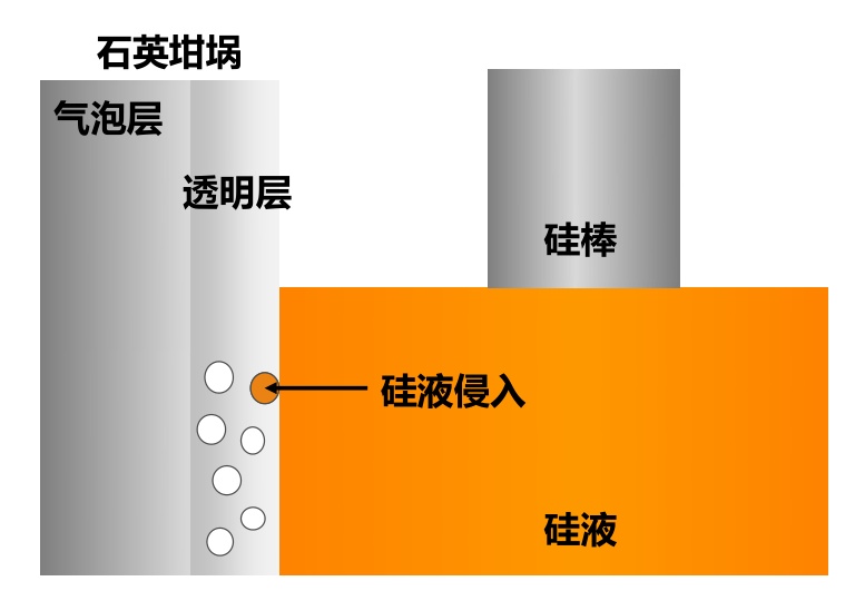 石英坩埚为半透明状,分为外层,也叫气泡复合层(不透明层,气泡含量较多),以及中内层,也叫气泡空乏层(真空透明层,不含气泡?~5mm)两层结构。外层需要把来自加热器的热量均匀散射,所以需要规定数量和大小的气泡,从而对硅熔体均匀加热;中内层是一?-5mm的透明层,成为气泡空乏层,对高纯石英砂高纯、低铝、低碱、抗析晶的要求更高。石英坩埚的内壁因为与硅熔体接触,在高温状态下,若内壁存在气泡,气泡会导致气体和杂质从坩埚内释放到熔体中从而扰乱到单晶硅的生长。那么石英坩埚中的气泡是怎么来的呢?它又如何去除呢?