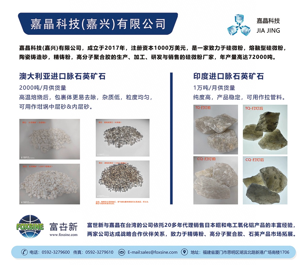 嘉晶科技(嘉兴)有限公司,成立于2017年,注册资本1000万美元,公司座落于浙江省嘉兴市南湖区嘉兴科技城内,占?万平方米。是一家致力于硅微粈/span>+/span>熔融型硅微粉,陶瓷铸造砂的生产、加工、研发与销售的硅微粉厂家,年产量高?2000吨。硅微粉是生产液晶玻璃基板和其他高新技术产品的主要原料,随着液晶玻璃基板行业的快速增长,对其基础原料硅微粉的质量要求也越高。为了满足硅微粉的市场需求,公司依托多年从事微粉行业已有的深加工技术和工艺,引进先进的德国进口加工及研发设备,开展硅微粉的深加工、/span>