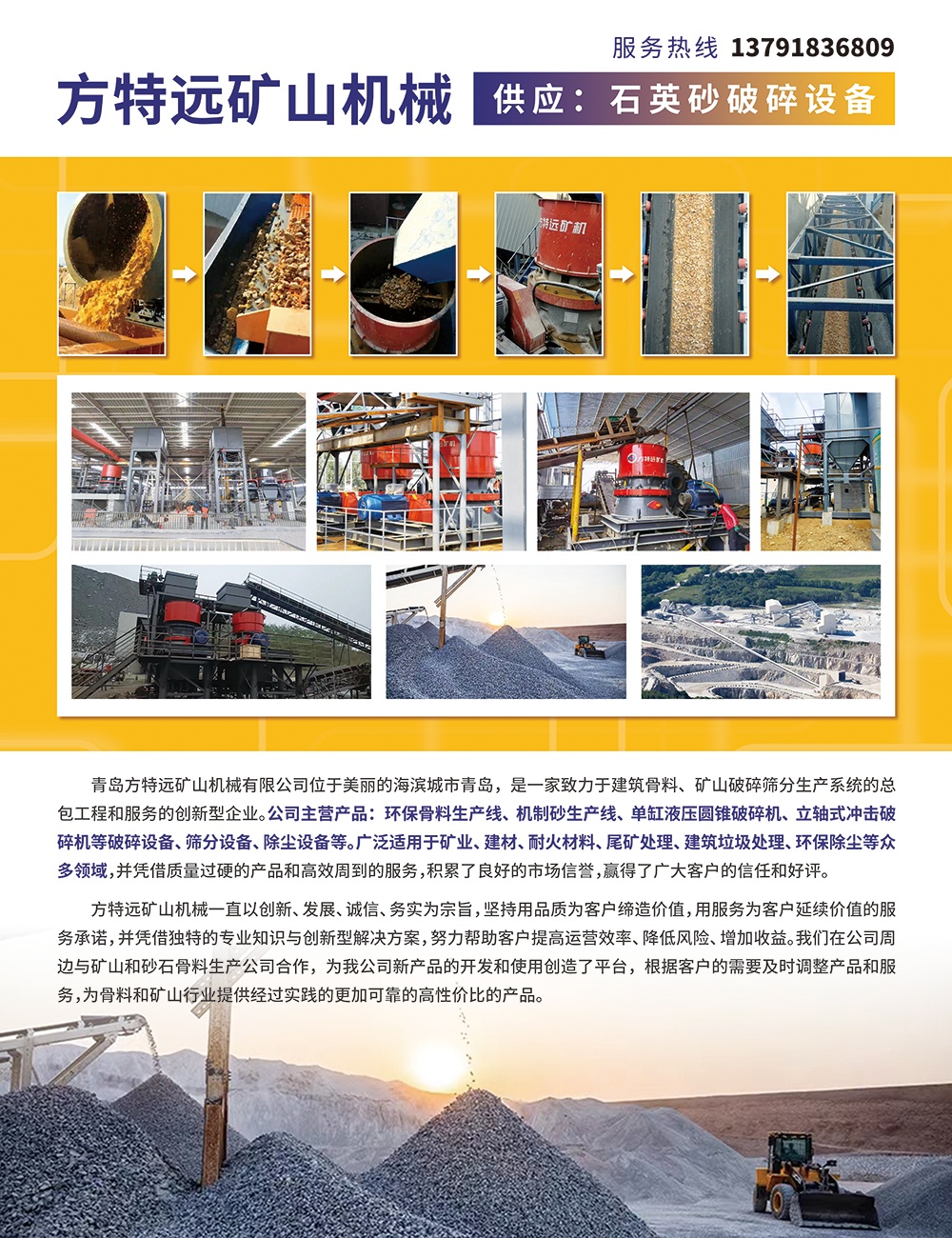 青岛方特远矿山机械有限公司始创于2002年,?017?月更名为青岛方特远矿山机械有限公司。公司位于美丽的海滨城市青岛,前身是专为大型矿山企业提供设备研发、制造和维护的供应商。公司自成立起,秉承“科技创新,诚信经营”的立业精神,先后引进欧美国家一系列先进破碎技术,并不断创新、研发,如今已发展为从事矿山机械成产制造、销售、服务、研发于一体的专业化综合性企业、/p>