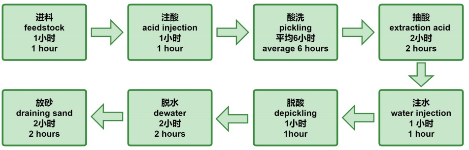 根据酸洗流程图可知,酸洗石英砂酸洗分为八个主要流程,全过程约?6小时,其中酸洗是耗时最长的也是最举足轻重的一个步骤、/p>