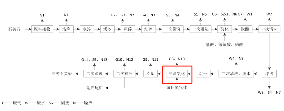 高纯石英砂生产工艺及产污及流程图