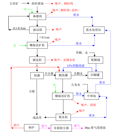 拟建项目以石英矿、草酸、石灰、聚丙烯酰胺、聚合氯化铝等为原料,通过湿法球磨、筛分、螺旋洗矿、磁选、半成品检测、酸洗、清洗、脱水、成品贮存等工序生产光伏玻璃砂。拟建项目建成后将形成日处理200吨,年产 60 万吨光伏超白石英砂,新增就业岗位50个的规模、/p>