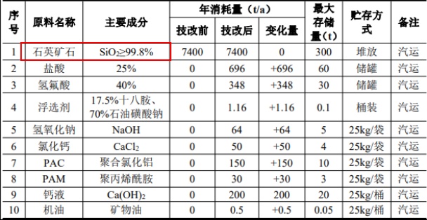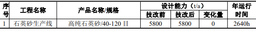 该项目以纯度?9.8%的石英矿石为原料,生产高纯石英砂,但技改后的具体纯度是多少,尚未透露。技改后工艺丹石英石→粗破→焙烧→水淬→制砂一筛分→磁选→酸洗(在反应釜中酸?→水洗→浮选脱水→烤砂→筛分→磁选→包装入库:同时对现有公用工程进行适应性技术改造,建设污水处理竘生产废水经过处理达标后接入工业污水处理厂。该项目建成后可形成年产5800吨石英砂的生产能力,产能不变、/p>