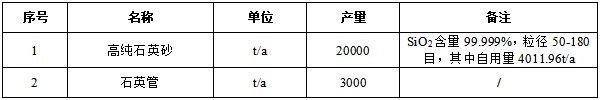 拟建项目总投?0000万元,主要建设高纯石英砂、石英管生产线及附属配套设施。生产过程主要以石英石毛料为原料,以盐酸、氢氟酸等为辅助材料,通过破碎、筛分、浸酸、色选、焙烧、水淬、细碎、酸化提纯、清洗、脱水、烘干、磁选、氯化、冷却等工序生产高纯石英砂;以自产高纯石英砂等为原料,通过熔融、拉管、割管、脱羟等工序生产石英管。拟建项目预计投产日期为2024?月,项目建成后将新增50个就业岗位,形成年产 20000吨高纯石英砂?000吨石英管的规模、/p>