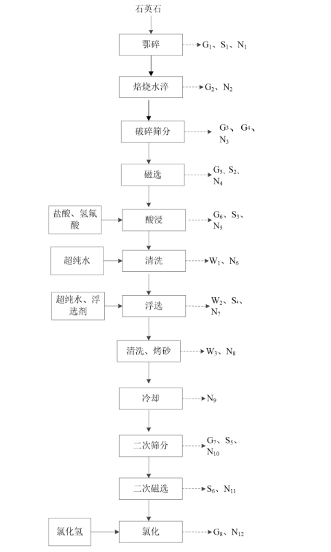 其中,高纯石英砂生产工艺流程为鄂碎、焙烧水淬、筛分、磁选、酸浸、清洗、色选、浮选、清洗、烤砂、冷却、二次筛分、二次磁选、氯化、/p>