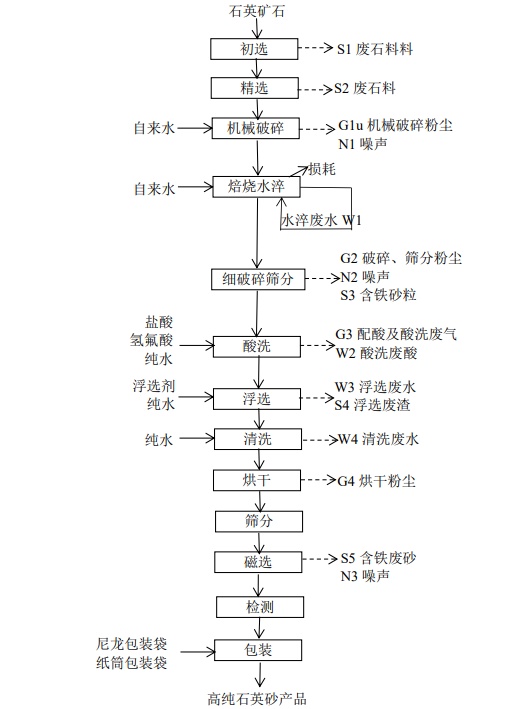 近日,东海生态环境局对连云港宏皓福石英制品有限公司年?000吨高纯石英砂技术改造项目环境影响评价受理情况进行了公示。项目总投?000万元,采用石英矿?初?精?机械破碎-焙烧水淬-细破碎筛?酸洗-浮?清洗-烘干--筛分-磁?检?包装等工艺生产高纯石英砂。技改后产品产能为年?000 吨高纯石英砂、/p>