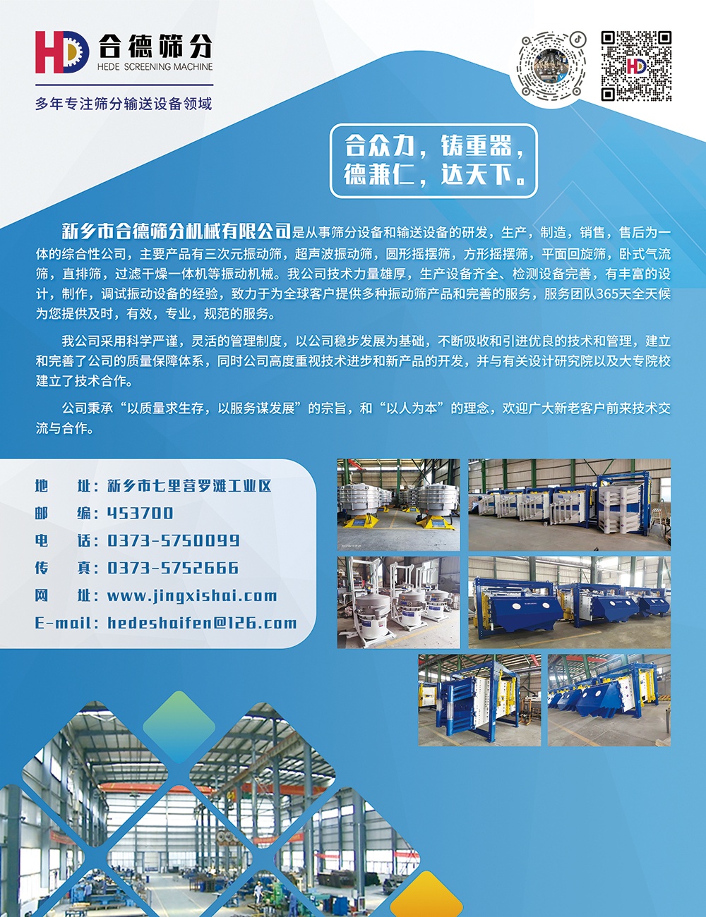 新乡市合德筛分机械有限公司是从事筛分设备和输送设备的研发,生产,制造,销售,售后为一体的综合性公司,主要产品有三次元振动筛,超声波振动筛,圆形摇摆筛,方形摇摆筛,平面回旋筛,卧式气流筛,直排筛,过滤干燥一体机等振动机械。我公司技术力量雄厚,生产设备齐全、检测设备完善,有丰富的设计,制作,调试振动设备的经验,致力于为全球客户提供多种振动筛产品和完善的服务,服务团队365天全天候为您提供及时,有效,专业,规范的服务、/span>