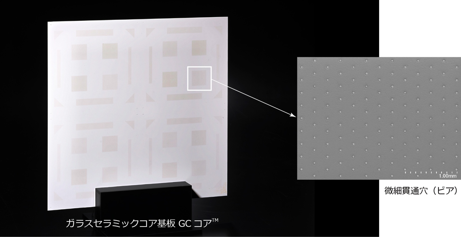 对于普通玻璃基板来说,当用CO2激光器钻孔时,一定比例的玻璃基板会产生裂纹,从而导致基板破裂。而GC Core?具有陶瓷不易变形、不易开裂的特性,因此可以高速且无裂纹地钻孔。此外,在普通玻璃基板上钻孔时,一般采用激光改性和蚀刻打孔,以避免裂纹,但这种方法在技术难度大且加工耗时长,成本高。GC Core? 可以使用广泛使用 CO2激光加工机进行钻孔,因此有望降低量产成本、/p>