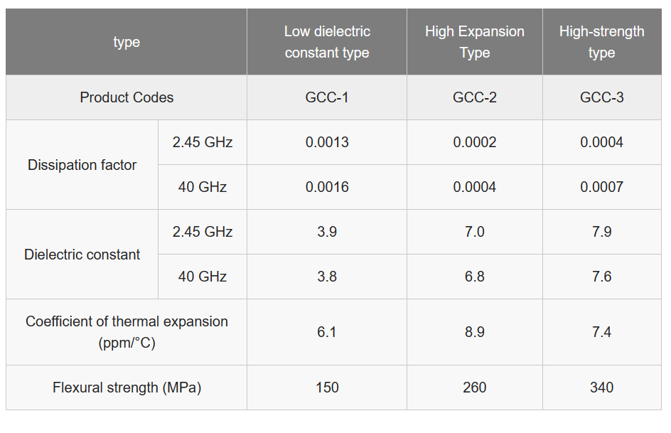 因为,GC Core? 的属性取决于玻璃和陶瓷的成分和混合比,可以根据客户的需求进行定制。除了介电性能优异的低介电常数类型外,日本电气硝子还提供与树脂基板的热膨胀相匹配的高膨胀类型和高强度类型,从而可以开发可用于广泛应用的基板、/p>