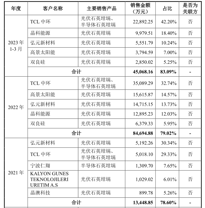 2021年,2020年,2023?-3月,美晶新材来自前五大客户的销售收入占主营业务收入的比重分别为78.60%?9.02%?2.24%,存在客户集中度较高的风险?022年?023年,TCL中环都是公司第一大客户,2021年为第二大客户,若公司的主要客户经营状况、市场竞争地位出现重大不利变化,将会影响主要客户对公司的采购需求,对公司的销售收入产生不利影响、/p>