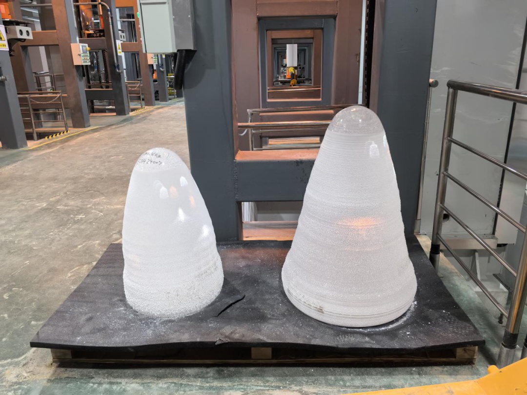 先进气炼石英主要生产用原料为高纯合成石英,将硅料加入石英打砣机中,经过高温作用下熔融流入熔炉炉?进行沉积堆溶作业,在沉积生长流动过程中,在不同的沉积高度上形成不同直径的同心圆熔融玻璃态圆柱体石英玻璃碇;高度每堆积生长到20mm~50mm时,开始自整形,石英火头和熔融玻璃态圆柱体石英玻璃碇一起以径向移动方式向熔炉炉腔内壁运动,使熔融玻璃态圆柱体石英玻璃碇最大直径处与炉腔内壁产生摩擦,产生形变,使产品外型尺寸在高度范围内达到上下等径要求,从而得到产品、/p>