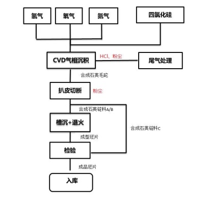 本项目高纯合成石英产品,主要生产用原料为四氯化硅,所有原材料均为外购。CVD法是高纯合成石英主流工艺。CVD法是将原料SiCl4气体和氢气以及氧气,通过燃烧器被导入沉积炉中,氢气和氧气燃烧产生水和大量的热,SiCl4遇水产生水解,生成的SiO2晶态微粒堆积在旋转的靶材上,并在高温下直接被融化成非晶态。高纯合成石英产品具有紫外透过率高、光吸收系数低、光学均匀性高、激光损伤阈值高、膨胀系数低和耐辐照等优点、/p>