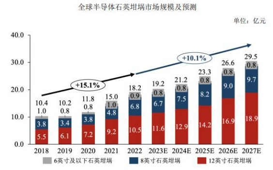 在半导体石英坩埚领域,国外半导体产业逐渐转移至国内,随着新能源车、智能电网、自动驾驶、人工智能的发展? 英寸 12 英寸半导体硅片出货量持续增长,我国半导体硅片供应商开始加码大硅片产能布局,对半导体石英坩埚的需求持续增加,预计 2027 年,全球半导体石英坩埚市场规模将扩大 29.5 亿人民币,期间年复合增长率为 10.1%。目前,国内个别企业开展了 32 英寸半导体级石英坩埚的研发工作并具备量产能力、/p>