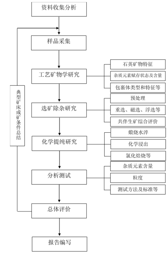 高纯石英用硅质原料评价工作通常采用资料收集分析、样品采集、工艺矿物学研究、选矿除杂研究、化学提纯研究、分析测试、总体评价、报告编写的步骤开展评价工作、/strong>