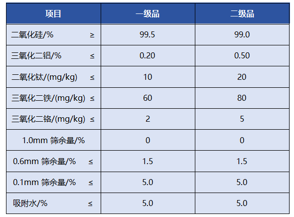 其中,光伏用高纯石英砂的粒径应在70μm~350μm范围内,且在该粒径范围的累积质量分数应大于或等于90%。粒径小?00μm或大?00μm的累积质量分数均应小?%;光伏用高纯石英砂中二氧化硅含量应大于或等于99.99%,灼烧失量应小于或等于0.01%;光伏用高纯石英砂杂质元素总含量应小于或等?5μg/g,其中钾、钠含量总和小于2.5μg/g、/p>
