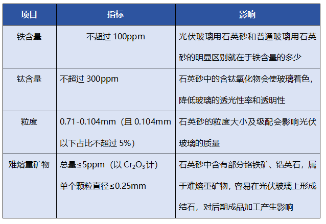 石英砂形成过程中伴随着大量的杂质矿物,无法直接找到未经处理就可以满足光伏玻璃生产用的低铁石英砂,加工后才能用于光伏玻璃的配料。光伏玻璃对石英砂的质量要求主要体现在四方面:铁含量、钛含量、粒度、难熔重矿物、/p>