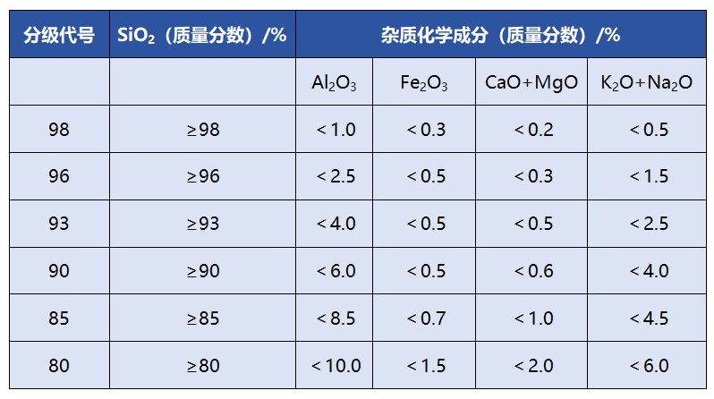 行业标准《JC/T 529-2000平板玻璃用硅质原料》中有关平板玻璃用石英砂的化学成分、粒度组成等指标要求如下9/p>