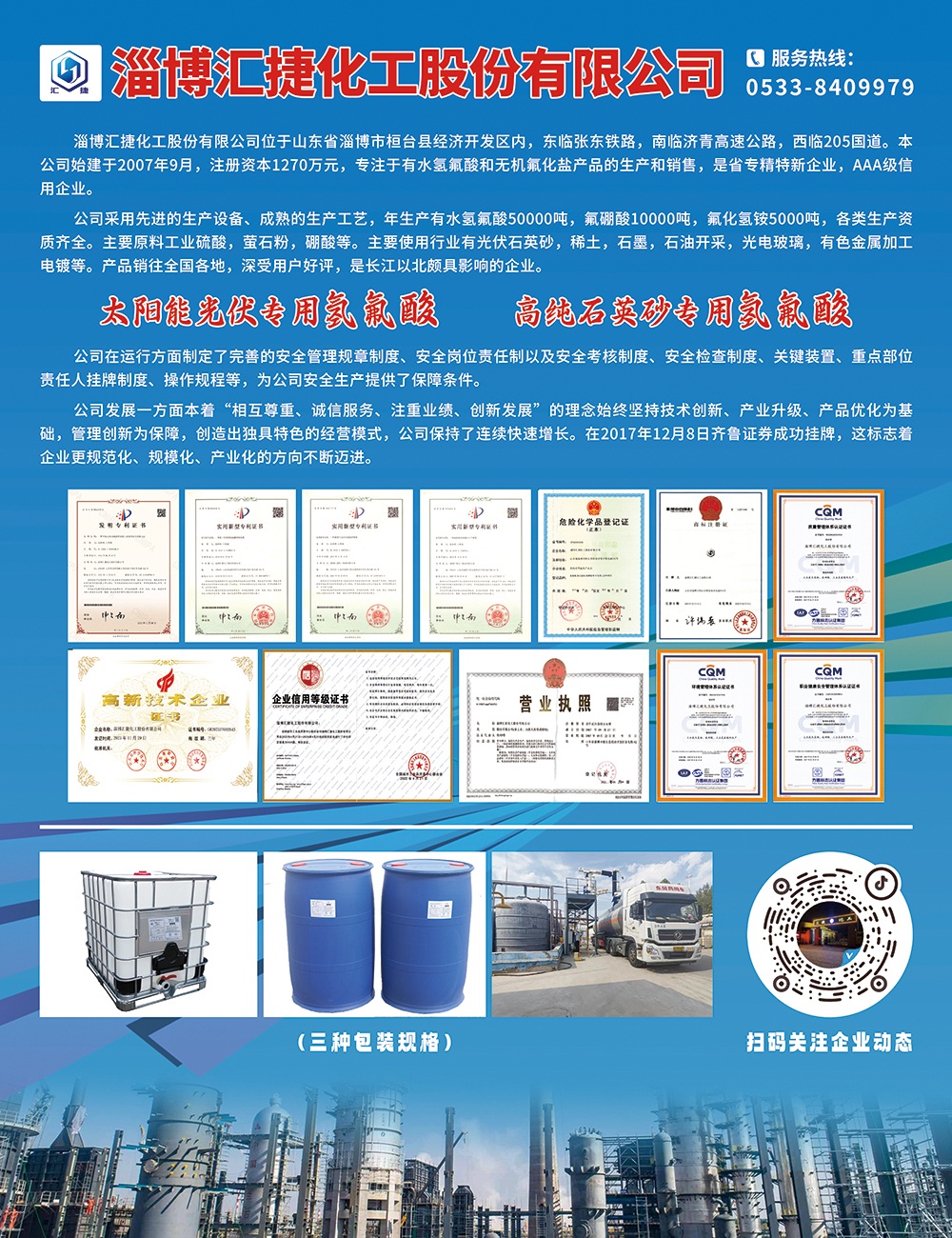 淄博汇捷化工股份有限公司始建?003?月,是山东省内颇具影响的专业生产有水氢氟酸和氟化盐的企业。公司采用先进的生产设备、成熟的生产工艺,检测仪器完备,达到节能、降耗、环保、安全生产,并经安全、环保、质检等部门验收,获得相关许可,年产有水酸50000吨,电子?000吨,氟化氢铵3000吨,氟硼?000吨,产品销往全国各地,主要使用行业有稀土、石墨、石油开采、玻璃加工、有色金属加工等、/p>
