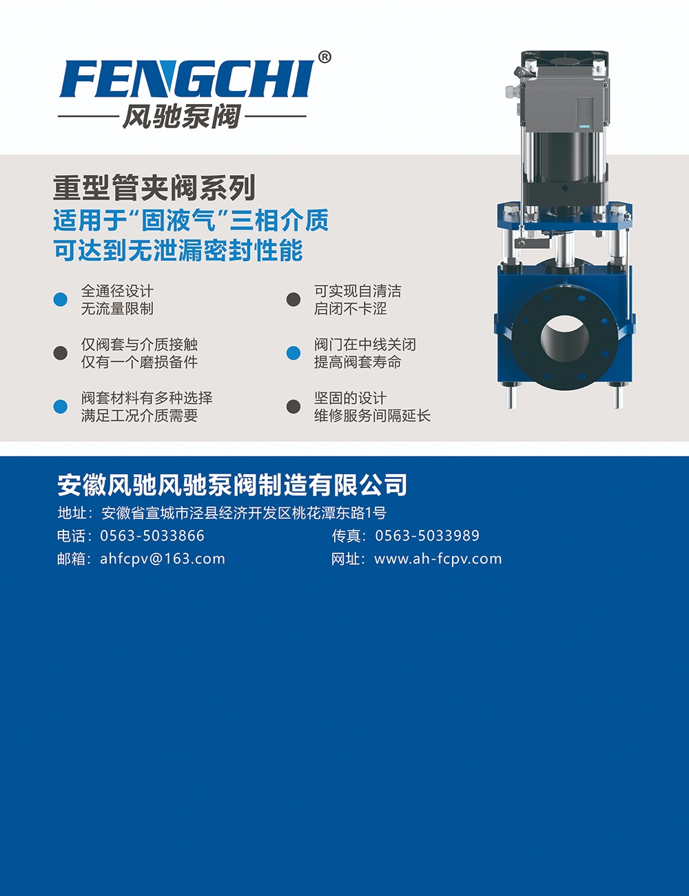 安徽风驰泵阀制造有限公司专业生产管夹阀、气动夹管阀,浆料刀闸阀等产品,专注于苛刻工况下的流体控制解决方案,现有员工50余人,具备大型化及高压管夹阀系列产品的设计与制造能力,是国家高新技术企业,并拥有众多发明及实用新型专利,产品广泛应用于国内外大型矿山中,具备耐磨耐腐蚀、免维护,高性价比等特点,是替代常规阀门的不二之选、/p>