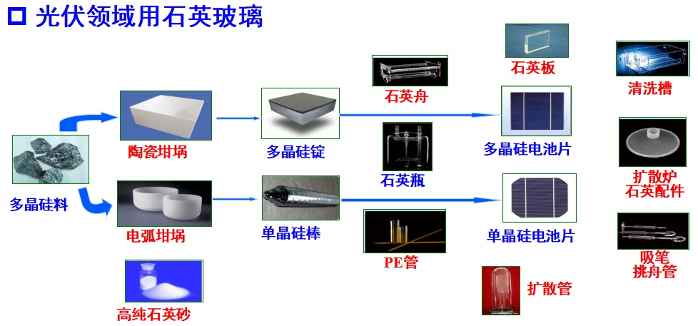 前端工序石英器件9/strong>扩散、氧化环节使用大量的石英玻璃扩散管及石英法兰、石英玻璃炉管(支托或运载石英舟进入或者退出扩散炉)、石英舟(承载硅片)、支架(承载多个石英舟)等器件产品、/p>