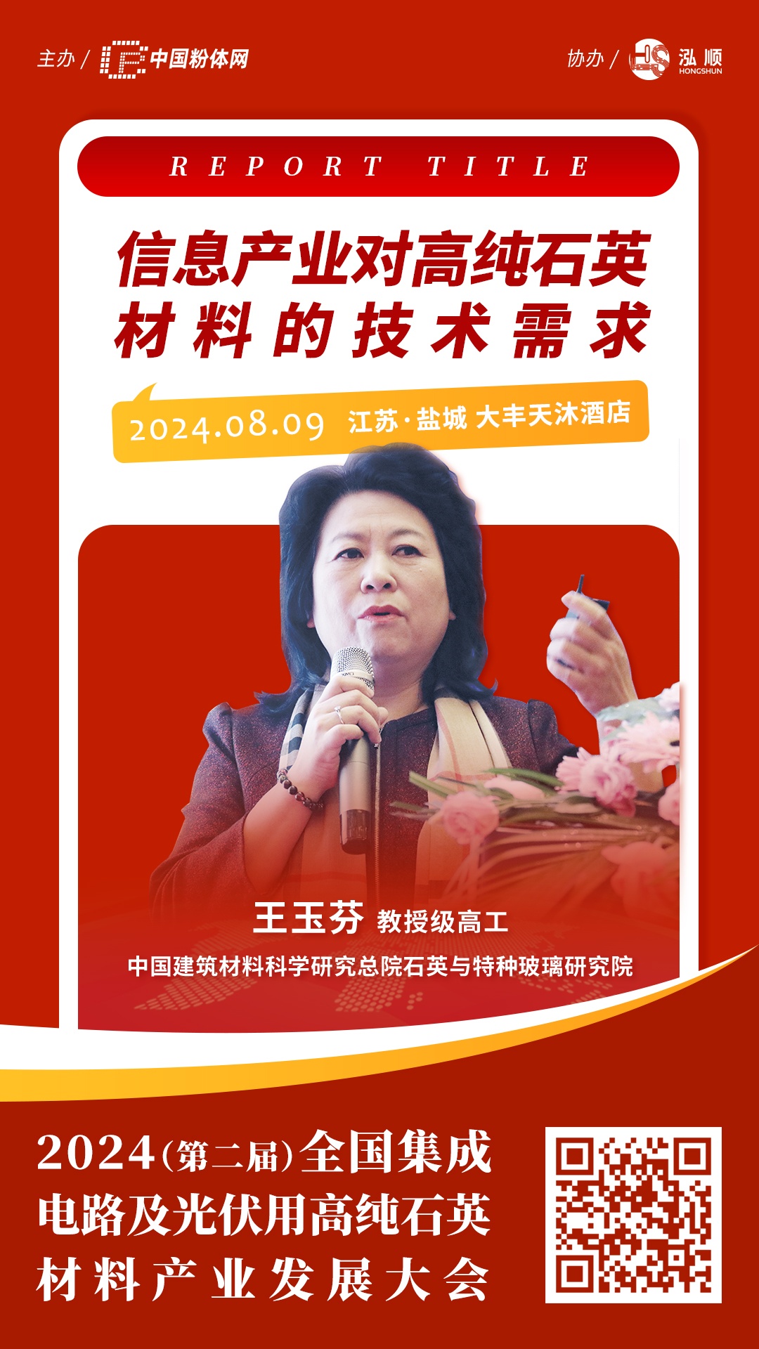 2024??日,中国粉体网将在江苏盐城大丰天沐酒店举办‛span style="text-align: justify; color: rgb(192, 0, 0);">2024(第二届)全国集成电路及光伏用高纯石英材料产业发展大伙/strong>”,届时,来自中国建筑材料科学研究总院石英与特种玻璃研究院的教授级高工王玉?/strong>将作〉strong>信息产业对高纯石英材料的技术需汁/strong>》报告、/span>