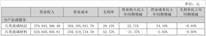 石英玻璃制品9span style="color: rgb(192, 0, 0);">实现营业收入3.8亿元,较上年同期增长22.71%;石英玻璃材料:实现营业收入5.3亿元,较上年同期减少21.37%、br/>