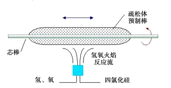 气相轴向沉积法和和管外气相沉积法均属于间接合成法,两者的原理相同,主要区别在于燃烧器及沉积体的布置方式不同。其中,VAD法中沉积体的布置方式为立式,燃烧器固定在底部对准沉积体的底部端面进行沉积;OVD法的沉积体为卧式,在疏松体沉积过程中燃烧器做往复运动、/p>