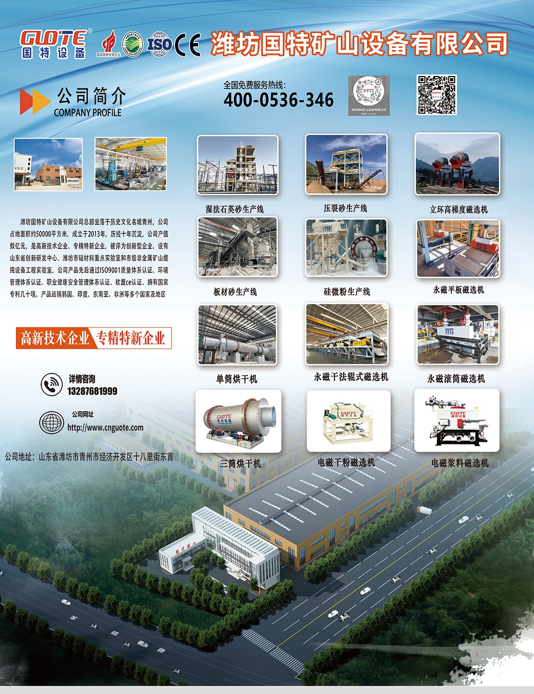 潍坊国特矿山设备有限公司总部坐落于历史文化名城青州,公司占地面积?0000平方米,成立?013年,历经十年沉淀,公司产值数亿元。是高新技术企业、专精特新企业,创新型企业,设有技术研发中心,潍坊市硅材料重点实验室和市级非金属矿山提纯设备工程实验室,公司产品先后通过ISO9001质量体系认证、环境管理体系认证、职业健康安全管理体系认证、欧盟ce认证、拥有国家专利几十项 国特设备长期致力于石英砂、石英板材砂、硅微粉专用设备,立环高梯度磁选机、平板磁选机、滚筒磁选机及其他石英砂配套设备的生产研发和提供上述生产线的实验、设计、咨询及整线供货;经十年如一日的辛勤探索公司建立了集科研开发、工程设计、生产安装、调试服务为一体的服务体系 通过国特人的拼搏与奋斗,成就了以“可靠、高效、简单”经营理念,以优质的服务、高度的敬业精神铸就了享誉国内外?quot;国特"品牌,走出了一条以绿色矿山为根本,高效环保的可持续性发展之路,为矿山设备行业的发展与繁荣做出了突出贡献、/p>