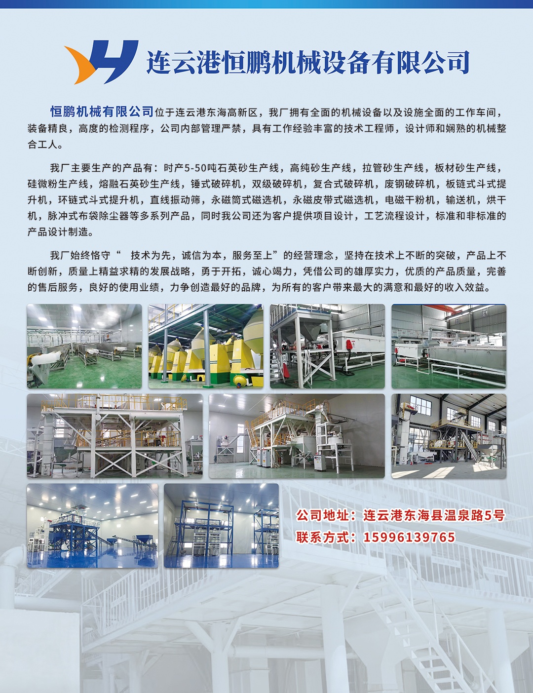 连云港恒鹏机械设备有限公司是一家专业从事高纯石英砂/拉管?板材?玻璃砂等生产线的高新技术企业。地处于被誉为“中国水晶之都”的江苏省连云港市东海县,占?0余亩。随着全国石英砂行业的高速发展并依附于当地丰富的硅产业园优势,我司于2012年成立了“东海县石湖乡诚鹏机械厂”专注于石英砂破碎设备的研发和生产并?018年扩大为连云港恒鹏机械设备有限公司”。产品不断销往国内外,在国内福建,广东,山东,河南甘肃,陕西,广西,宁夏等30多个省市自治区实现内销逐年增长;在国外非洲,印度,越南,外蒙,斯里兰卡等20多个国家实现外销逐年增长。历?0多年的发展,恒鹏已成为年销售收入过亿元的专业石英砂生产线基地、/p>