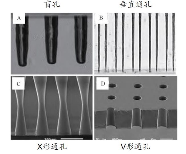 玻璃通孔技?TGV)是一种在玻璃基板上制造垂直电气互连通道的技术,通过在玻璃基板中精确打孔,并在孔壁上沉积导电金属层,实现上下层电气信号的互连。玻璃通孔的制备需要满足高速、高精度、窄节距、侧壁光滑、垂直度好以及低成本等一系列要求,如何制备出优良的玻璃通孔一直是多年来研究工作的重心。目前主流的玻璃通孔加工成型方法有喷砂法、聚焦放电法、等离子刻蚀法、激光烧蚀法、电化学放电法、光敏玻璃法、激光诱导刻蚀法等、/p>