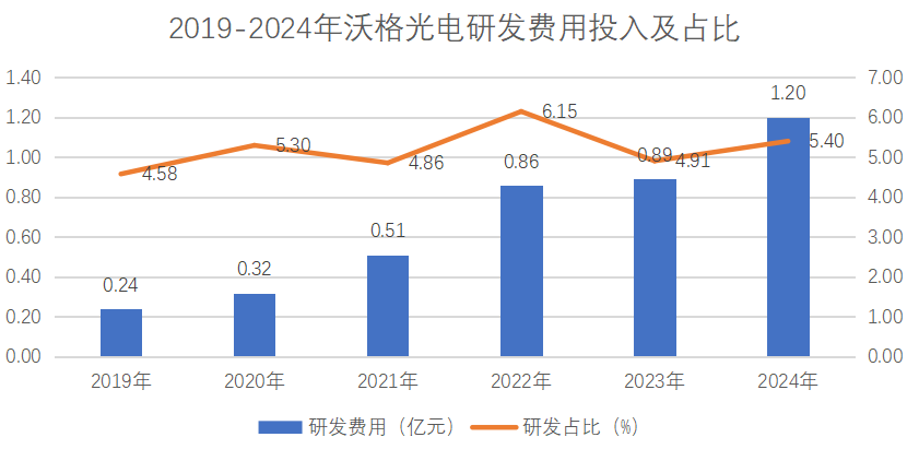 2019-2024沃格光电研发费用投入及占 来源:沃格光甴/p>