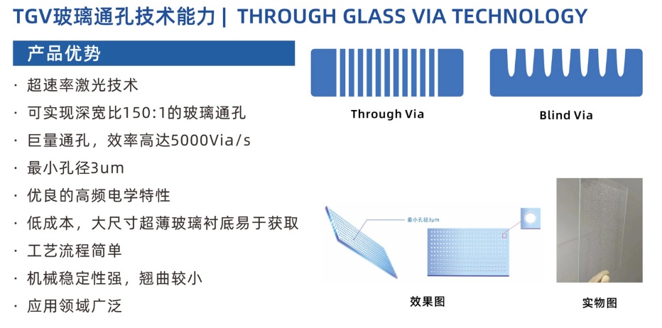 在半导体先进封装领域同样成效显著,沃格光电子公司通格微有着全球领先的TGV玻璃基板加工能力(玻璃基通孔、RDL线路导通以及SAP双面多层线路堆叠技术),已实现通孔孔径最小至3微米,深径比高达150:1,支持高达四层的线路堆叠,可替代传统硅基TSV技术的玻璃基TG技术,该技术能广泛应用在高算力芯片、射频器件、直显基板、微流控芯片等领域,为新型显示、半导体先进封装?G/6G通信行业提供高性能的玻璃基线路板解决方案、/p>