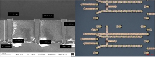 深光谷科技所开发的TGV光电interposer采用激光诱导刻蚀结合多层重布线(RDL)工艺,通孔深宽?:1,基板厚?30um,表面平整度1.2um,支?+1层RDL,挖槽深?0um,支持光纤阵列的耦合对准,支持电芯片flipchip封装,支持EML/SOA/硅光/铌酸锂等光芯片植球倒装,实测通孔和RDL布线带宽超过110GHz、/p>