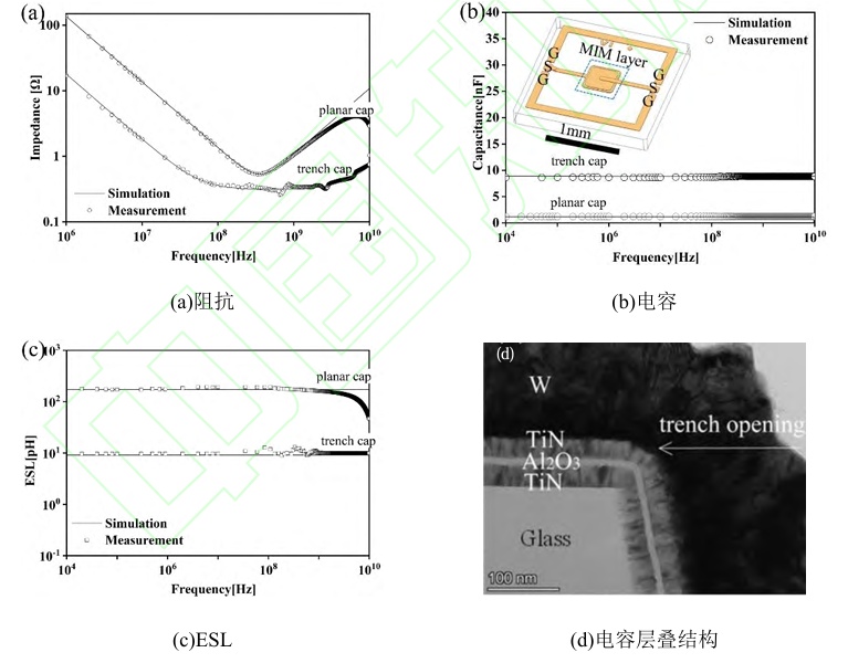 2023年胡志辉等人设计了一种基于玻璃基板的深沟槽电容器(DTC)。所提出的玻璃DTC模块的电容与DTC单元的数量成正比,最终实?8nF/mm2的高电容密度,击穿电?VBD)?7.83±2.3)V。同时,电容器的等效串联电感(ESL)和等效串联电阻(ESR)分别低?0pH?15mΩ。与硅基DTC相比,该DTC具有成本低、生产效率高、电性能好、体积小等优点、/p>
