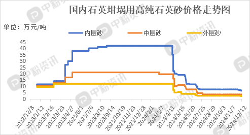 中国粉体网讯国产高纯石英砂的价格,以光伏坩埚中层砂为例,2023年巅峰时期均价在21万元/吨,2024?月高纯石英砂价格开始一路下滑,至年底时均价已降?.5万元/吨,暴跌了约83%,且该价格已徘徊数月之久、未见有突破、br/>