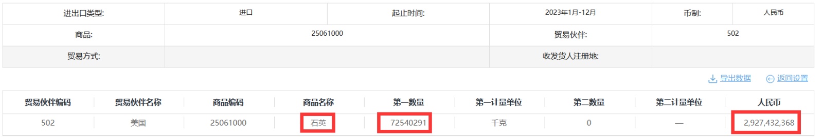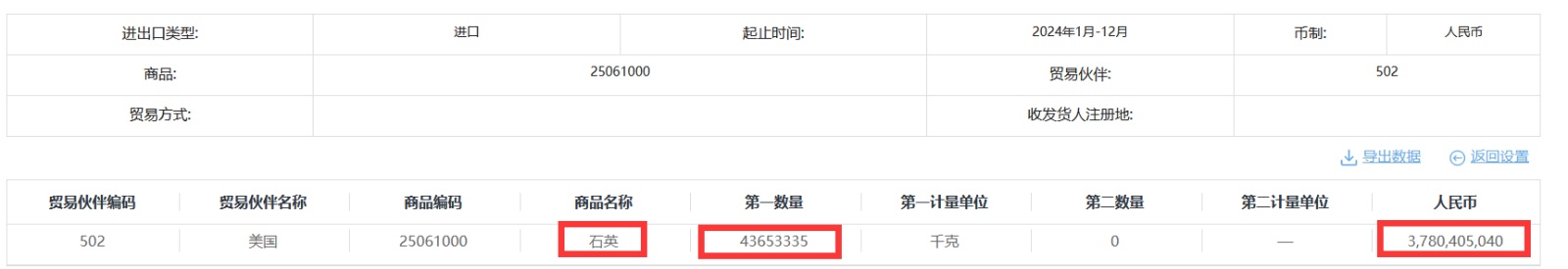 中国粉体网独家从海关统计数据查询获悉?023年,中国从美国进口的高纯石英数量?.25万吨,合计金额约29.27亿元,均价约?.04万元/吨;2024年,中国从美国进口的高纯石英数量?.37万吨,合计金额约37.8亿元,均价约?.65万元/吨,相比2023年价格暴涨了114%、br/>