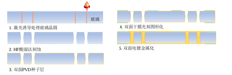 TGV技术本质是在玻璃基板上制作垂直互连通孔,实现三维集成等功能,其具体工艺步骤有如下几个方面: