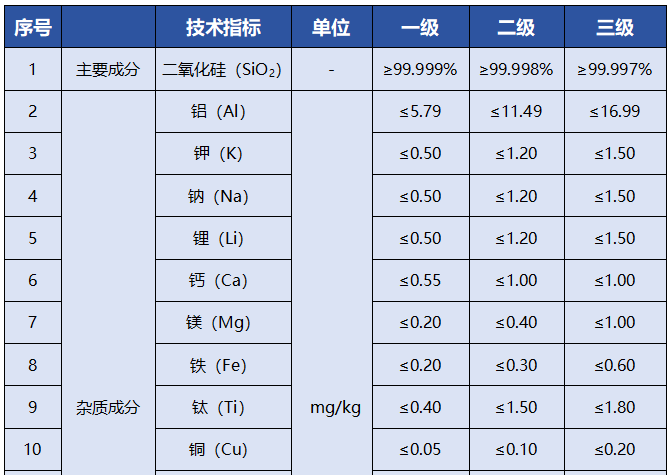 文件中指出,石英砂按杂质元素含量分为Ⅰ级、Ⅱ级、Ⅲ级。石英砂粒度分布以特定累计体积百分比下颗粒粒径范围表示。等离子体熔融法、气炼熔融法、连熔法等石英制备工艺对石英砂粒度分布有不同要求、/p>