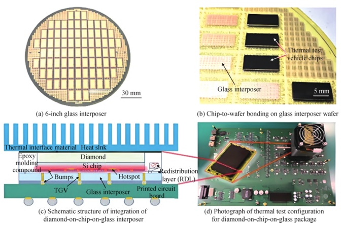 金刚?芯片-玻璃中介层封装集成和热测?nbsp; 来源:Zhong.Heterogeneous integration of diamond-on-chip-on-glass interposer for efficient thermal management.