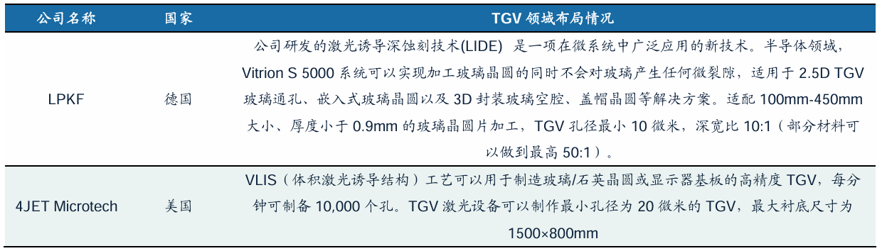 国内的TGV激光设备厂商包括帝尔激光、大族激光、德龙激光等、/p>