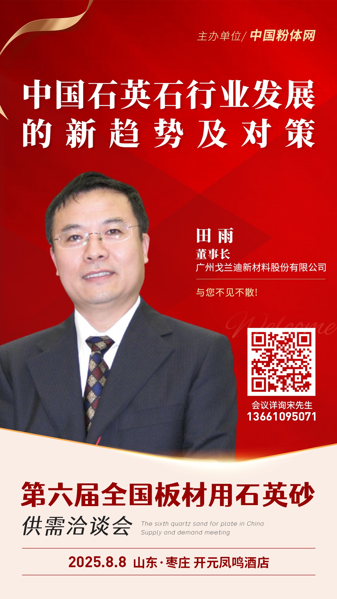 2025??日,由中国粉体网主办皃span style="color: rgb(192, 0, 0);">第六届全国板材用石英砂供需洽谈伙/strong>将在山东枣庄召开+strong>广州戈兰迪新材料股份有限公司董事长田?/strong>将作《中国石英石行业发展的新趋势及对策》的报告,深度剖析行业当前面临的痛点难点,精准研判未来技术突破的核心方向,为行业发展拨开迷雾、/p>