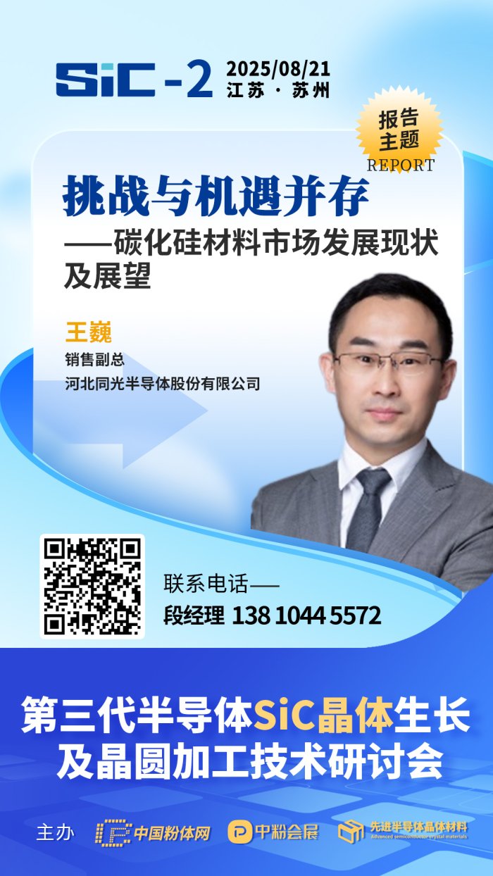 未来,SiC衬底行业发展方向该指向何方?2025??1日,中国粉体网将在苏州举劝strong>第三代半导体SiC晶体生长及晶圆加工技术研讨会。届时,来自河北同光半导体股份有限公司销售副总王巍将带来题为〉strong>挑战与机遇并存——碳化硅材料市场发展现状及展朚/strong>》的报告,报告将评估当前SiC衬底市场的竞争格局,以及未来几年内可能影响行业发展的关键因素。将提出对SiC衬底产业化进程的展望、/span>