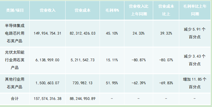光伏业务短期调整:光伏太阳能行业用石英产品收入同比下?0.87%,主要受本期光伏市场需求大幅下滑影响,属于行业周期性波动,暂未对公司整体经营造成重大冲击、/p>