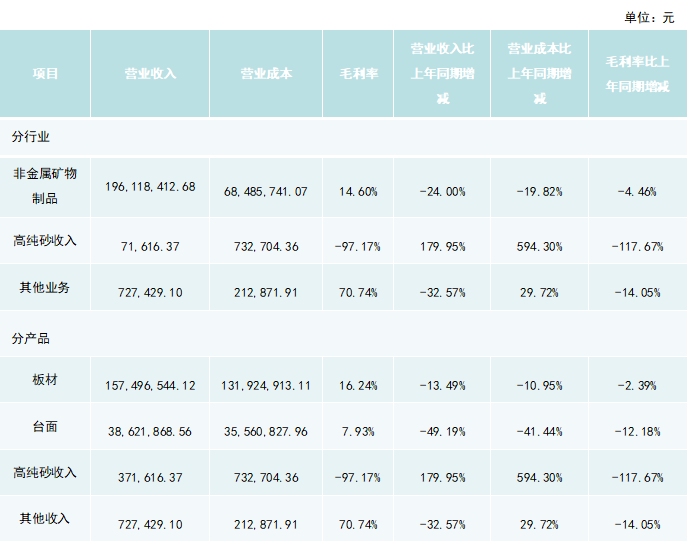 2025年上半年,中旗新材营?.97亿元(同比降23.93%),净?52.3万元(同比降89.35%);核心产品中,人造石英石板材营收1.57亿元(降13.49%,毛利率16.24%)、台?.39亿元(降49.19%,毛利率7.93%),高纯石英砂营?7.2万元(增179.95%,毛利率-97.17%)、/p>