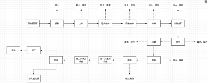 普通石英砂生产工艺主要为:原料装卸、破碎、筛分、滚筒洗砂、脱水、过滤、球磨、筛分、磁选、水力分级、脱水过滤、色选等、/p>