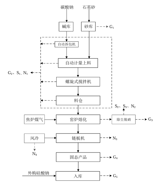 该项目产品的主要生产工艺分为两步:第一步是生产硅酸钠,硅酸钠的生产方法包括干法和湿法工艺,干法工艺一般以石英砂和纯碱为原料,通过配比进入马蹄焰炉,在高温条件下形成熔融状态硅酸钠,后经冷却形成固体产品;湿法工艺以液体苛性钠和石英砂为原料,按适当比例混合加入压热釜内,用蒸汽加热并进行搅拌,使之直接反应而成液体硅酸钠,经过滤、浓缩制得成品。该项目硅酸钠采用干法工艺、/p>