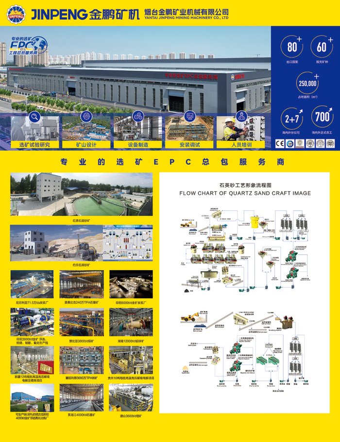 烟台金鹏矿业机械有限公司位于风光迤逦的烟台开发区,公司占地面?70亩,建筑面积230亩,现有职工500余名,其中工程技术人?00余人,年产值近10亿元。中国黄金集团、山东黄金集团、紫金矿业、招金集团、恒邦股份等大型上市公司,也是金鹏矿机的合作伙伴。金鹏矿机在立足中国的同时,EPC工程已遍布世界七十多个国家和地区,其完善的选矿试验研究,工程设计,设备供应,安装调试,人员培训深受国外矿企的欢迎,并成为国外矿企重要的合作伙伴?/p>