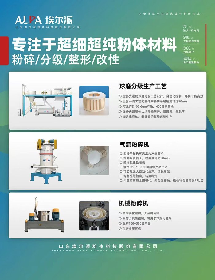 山东埃尔派粉体科技股份有限公司是国内知名的超细粉体解决方案提供商。公司位于山东省潍坊市安丘市先进制造业产业园,拥有?30亩的机械生产基地和现代化的管理制度,专注于超细超纯粉碎与分级研究、粉体形状控制与选择性粉碎、粉体表面改性、以及为粉体工程设备的系统集成提供解决方案,近三年年产值已超过10亿元、/p>