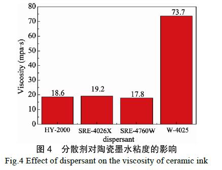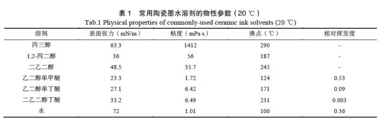 采用研磨分散法制备了水性黑色陶瓷墨水,主要研究溶剂含量和分散剂种类对陶瓷墨水性能的影响,同时对不同厂家生产的分散剂种类进行筛选。选出溶剂、分散剂?**分散效果时的添加量,进一步考查溶剂和分散剂对陶瓷墨水粒径的影响,从而对陶瓷墨水配方进行优化。测试结果表明:制备的水性黑色陶瓷墨水在30 天内不发生分层,保持良好的稳定性、br data-filtered="filtered" style="margin: 0px; border: 0px; padding: 0px;"/>喷墨打印技术打印的产品图案更精细,效果更逼真、无重复打印、操作简单的优势[1-2],已广泛应用于电子标签打印、电容器、显示器等领域。和普通喷墨印刷不同,陶瓷喷墨打印墨水在印刷后,还要进行高温的烧结,在不同的釉面配方或烧结温度下,其呈色效果也有所不同[3-5]。陶瓷墨水作为喷墨打印技术中核心要素,是指喷墨打印机中含有特殊陶瓷粉体、陶瓷色料或者颜色着色剂的一类液体[6]。陶瓷墨水一般由无机非金属颜?色料、釉?、溶剂、分散剂、表面活性剂及其它助剂构成。目前制备陶瓷墨水的方法主要有溶胶凝胶法[4-6]、反相微乳液法[7-10]、分散法[11-14]。溶胶凝胶法目前技术已较成熟,但其制得的陶瓷墨水固相含量较低,长期放置会产生沉淀,稳定性较差;反相微乳液法则制备成本高、难度较大,不适宜工厂化生产;针对上述两种方法的缺点,分散法作为一?**常用的方法,使陶瓷墨水工艺更为简单,成本更低廉,加之研磨技术的不断更新,更加容易实现工业化大生产、br data-filtered="filtered" style="margin: 0px; border: 0px; padding: 0px;"/>目前,市场上的陶瓷墨水大多是偏油性的。油性陶瓷墨水对环境和人体是有害的,随着人们对环保意识的增强,市场上急需开发出环保无毒的油性陶瓷墨水和水性陶瓷墨水,这将是未来陶瓷墨水的发展趋势、br data-filtered="filtered" style="margin: 0px; border: 0px; padding: 0px;"/>现在制备的陶瓷墨水配方体系均使用低极性的有机溶剂,着色颗粒平均粒径为200-400 nm。目前,制备陶瓷墨水的成本昂贵、技术难度大、稳定性差等问题,导致陶瓷墨水的种类不多,色域受到限制。但目前面对的难题是如何选择合适的分散剂来提高微米级陶瓷墨水的稳定性;水性陶瓷墨水配方体系更为复杂,添加的助剂种类繁多,在添加的同时,需要考虑各种助剂之间的搭配。同时,制备水性陶瓷墨水还应考虑防腐、杀菌等问题、br data-filtered="filtered" style="margin: 0px; border: 0px; padding: 0px;"/>1 实验过程以Cu-Cr-O 陶瓷色料为着色剂,以丙二醇、二乙二醇作为溶剂,添加分散剂、消泡剂等其它助剂进行均匀混合。实验一:按溶剂含量?%?0%?5%?0%?5%五个不同比例进行配比,将配好的溶液放入分散机中进行分散;分散后的浆料移入砂磨机中进行研磨?**通过过滤装置进行过滤,所得滤液即为水性黑色陶瓷墨水;实验二:在确?**溶剂含量的条件下,添加不同生产厂家的分散剂,进行分散、研磨、过滤等一系列相同的操作,得到水性黑色陶瓷墨水、br data-filtered="filtered" style="margin: 0px; border: 0px; padding: 0px;"/>2 结果与讨讹br data-filtered="filtered" style="margin: 0px; border: 0px; padding: 0px;"/>溶剂在陶瓷墨水中的作用是载体,它将着色颗粒、分散剂、助剂等成分分散或溶解在其中,从而形成一个新的稳定体系。它可以调节陶瓷墨水体系的粘度和流变性,不同的溶剂对着色颗粒分散性能和助剂的溶解性能不一样。选择溶剂应该考虑与着色剂的相容性、分散剂和助剂的溶解性。有相关文献[18-19]报告,至少选择一种低挥发性溶剂和一种高挥发性溶剂。要找到一个稳定点,需要经过无数次实验来验证,? 为常见的几种用作水性陶瓷墨水溶剂、br data-filtered="filtered" style="margin: 0px; border: 0px; padding: 0px;"/>综上所述,根据已查文献资料数据,从溶剂的溶解性、表面张力、粘度等因素考虑,选择丙二醇和二乙二醇作为制备水性陶瓷墨水的主要溶剂。其他条件固定不变的情况下,考察不同溶剂含量对陶瓷墨水粒度的影响,如? 所示、br data-filtered="filtered" style="margin: 0px; border: 0px; padding: 0px;"/>根据? 可知,随着溶剂含量的增加,陶瓷墨水体系中的颗粒分布由宽慢慢变窄。达?**窄时对应的溶剂含量为15%,颗粒粒径分布范围为68.1-341.9 nm,见?;随后继续增加溶剂含量,颗粒粒径分布范围逐渐变宽。所以,当溶剂含量为15%时,平均颗粒粒径?50-200 nm 左右?**粒径尺寸小于400 nm。当溶剂含量较低时,溶剂很难与添加的其它助剂达到充分混合溶解的效果,体系中的分散剂得不到很好的延伸,因此相互缠绕在一起,不能很好地吸附在着色剂小颗粒的表面。所以,当着色剂颜料颗粒研磨后,大颗粒居多,则会导致体系的研磨效率降低,沉降速率越大;随着溶剂含量的增加,溶剂发挥溶解作用,分散剂能很好的发挥自身的分散效果,从而使体系达到一个稳态。当溶剂含量?5%时,体系中的颗粒分布区间***窄。但是,体系的粘度也会随之增加,高粘度溶液环境会使研磨效果减低。研磨过程中由于着色颗粒和研磨锆珠之间的相互碰撞,会产生高温、多泡、粘度继续上升等现象。当溶剂含量超过20%时,小颗粒之间发生团聚,粒径分布范围变宽。所以,制备水性陶瓷墨水时将溶剂含量控制在15%较为合适、br data-filtered="filtered" style="margin: 0px; border: 0px; padding: 0px;"/>其他条件固定不变的情况下,考察不同溶剂含量对陶瓷墨水粘度的影响,如? 所示、br data-filtered="filtered" style="margin: 0px; border: 0px; 